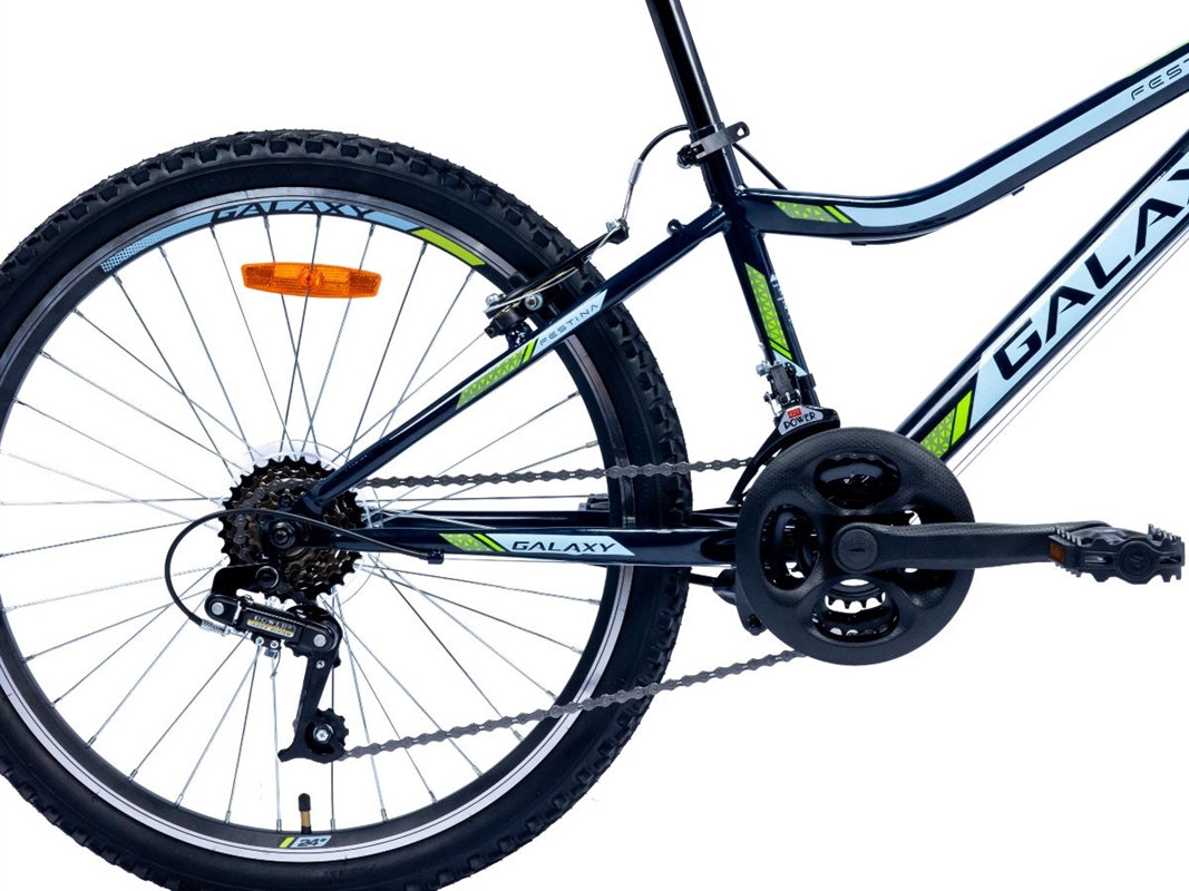 Bicikl GALAXY FESTINA 24"/18 je MTB bicikl dizajniran za vožnju po različitim terenima za decu uzrasta 9 do 11 godina, visine od 135 do 145 cm. Odlikuje ga čelični ram koji pruža čvrstinu i stabilnost tokom vožnje. Posebno dizaniran ram čini ovaj bicikl idealnim izborom za decu, a predstavlja i odličan izbor kao prelazni bicikl sa dečijeg na malo ozbiljniji bicikl.
